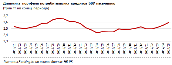 Сначала сумма таких кредитов выросла в марте текущего года на 1%, в апреле прибавила 1,4%, в мае месячный прирост уже составил 1,6%. Всего с начала 2017 года объем потребкредитов в РК (физлицам) увеличился на 4%, а за год - на 6% и составил 2,6 трлн тенге.