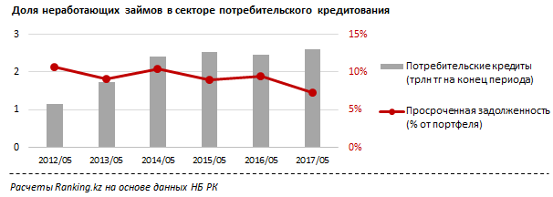 Текущий уровень просроченной задолженности - минимальный за последние 5 лет. Более низкие показатели доли неработающих займов в потребительском кредитовании в РК фиксировался до второй половины 2009 года.