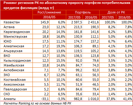 Замыкает топ-3 Мангистауская область - объем портфеля потребительских кредитов физлицам вырос на 18,8 млрд тенге, или на 16,8%, по сравнению с показателем на конец мая 2016 года.