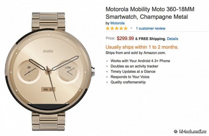 Скорее всего, это устройство станет своеобразным ответом Apple Watch, которые были недавно представлены компанией, в том числе в золотом исполнении. Правда, ценник на Moto 360 будет заметно ниже, чем у часов от компании из Купертино. «Золотая» версия на Amazon оценена в 299 долларов (приблизительно 12 510 рублей по актуальному курсу), в то время как часы с новым кожаным ремешком будут стоить 249 долларов (приблизительно 10 420 рублей по актуальному курсу). Дата поступления в продажу не называется, однако появление на сайте ритейлера с уже озвученными ценами говорит о скором выходе новинок в продажу.