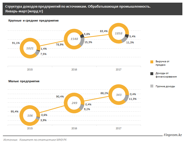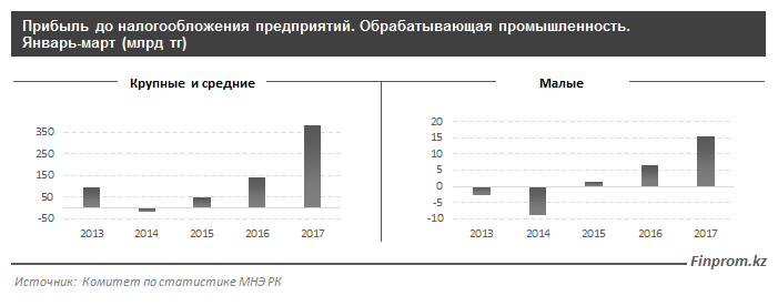 Прибыль обрабатывающих предприятий достигла исторического максимума в 1 квартале 2017 года. За 3 месяца им удалось заработать 398 миллиардов тенге чистой прибыли. Особенно активно зарабатывали крупные предприятия.