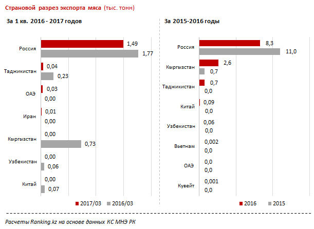 Практически весь объем продукции, поставляемой на экспорт, забирает Россия - в текущем году это составило 94,5%, или 1,5 тыс. тонн. За 2016 год в российском направлении было отгружено порядка 70% всего мясного экспорта РК. Однако продажи казахстанского мяса на российском рынке также сокращаются. За январь-март текущего года в РФ было продано на 15% меньше мяса, чем год назад. Упал экспорт и по другим направлениям: продажи в Таджикистан сократились в 6 раз в этом году, в Кыргызстан, Узбекистан и Китай за январь-март этого года не было продано ни одной тонны.