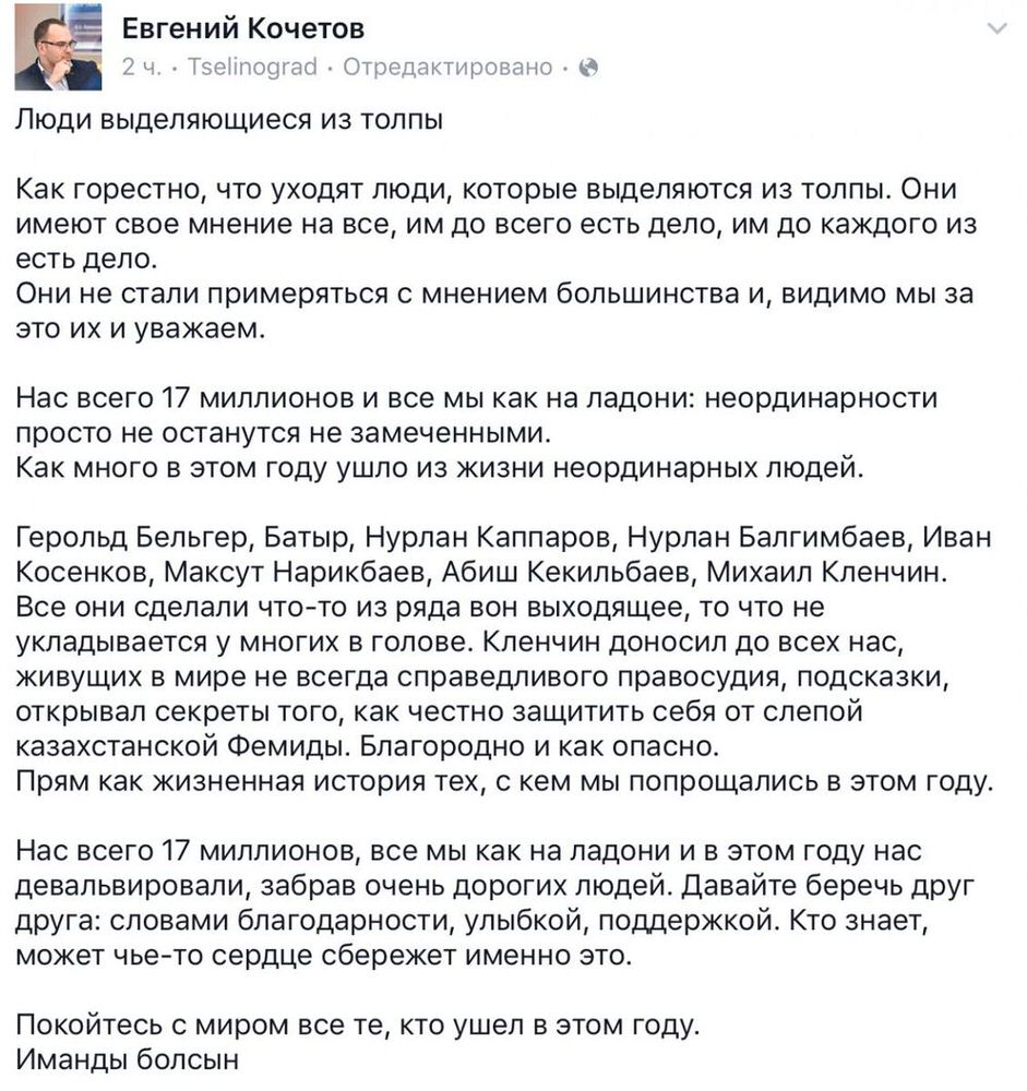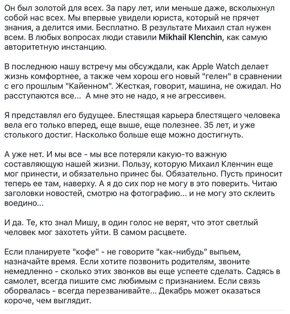 Вчера, 12 декабря, весь Казахстан шокировала страшная новость о смерти известного юриста Михаила Кленчина. С самого утра в социальных сетях то и дело появлялись разные версии, подтверждающие и опровергающие официальную на данный момент версию полиции о самоубийстве.