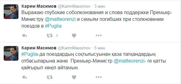 Премьер-министр РК Карим Масимов выразил соболезнования своему итальянскому коллеге Маттео Ренци в связи с крушением поездов на юге Италии.