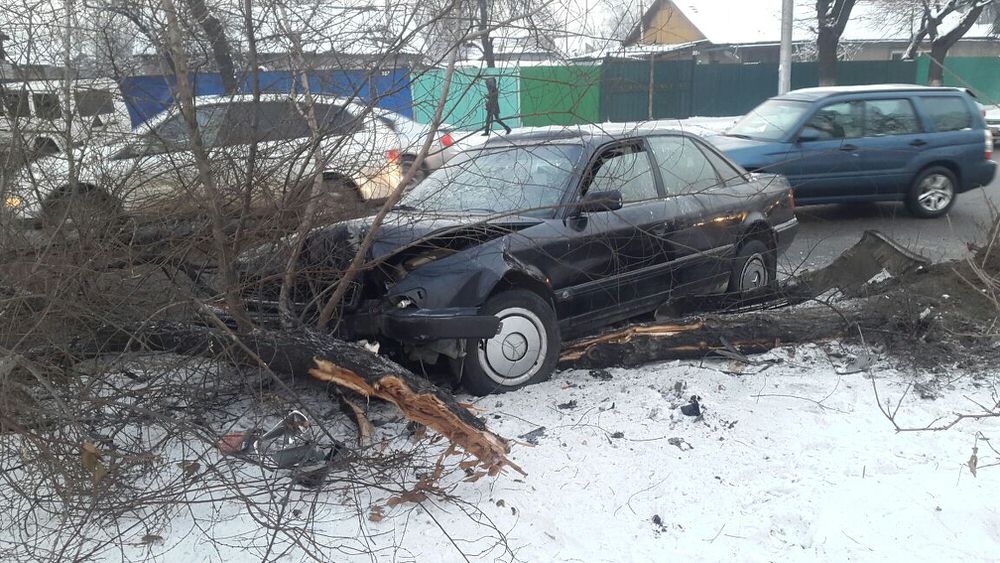Водитель автомобиля Ауди, двигавшийся по проспекту Райымбека в западном направлении, допустил наезд на дерево, передает Total.kz.