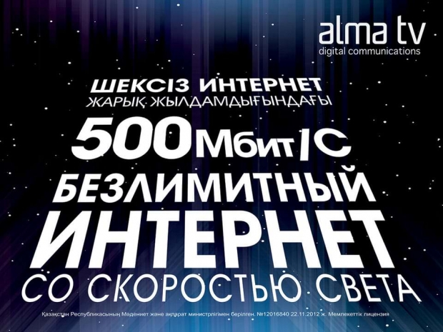 Ведущий оператор кабельного телевидения в Казахстане и провайдер Интернета Alma TV первым в стране начал предоставлять услуги доступа к сети Интернет в домашних условиях со скоростью до 500 мегабит в секунду. Это в разы превышает скорость, которую сегодня предлагают большинство операторов.