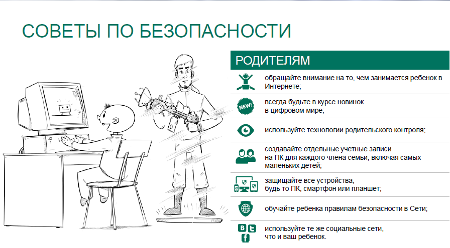 «Дети случайно или намеренно попадают на страницы с контентом 18+, и речь не только о порнографических страницах, но и об информации о наркотиках и суициде, сценах насилия, опасных хобби. В социальных сетях подростки часто общаются с незнакомцами, что само по себе представляет опасность: неизвестно, кто находится на другой стороне монитора и представляется сверстником ребенка. Не стоит забывать и про традиционные «взрослые» угрозы. Они актуальны и для детей: это игровая зависимость, фишинг и вредоносное ПО», – рассказывает управляющий директор «Лаборатории Касперского» в Казахстане, странах Средней Азии и Монголии Евгений Питолин.