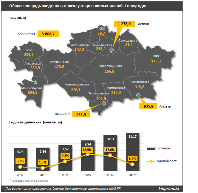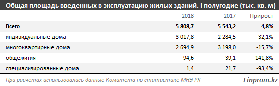 По итогам шести месяцев текущего года в эксплуатацию ввели всего 5,8 млн кв. м жилых зданий — это лишь на 4,8% больше, чем годом ранее, передает Total.kz со ссылкой на finprom.kz. Для сравнения, показатели I полугодия 2017 года обгоняли соответствующий период 2016 на 11%, более того — в январе-июне 2016 рост год к году составлял сразу 17%.
