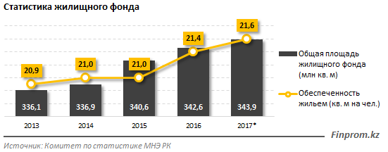 Более того, на одного казахстанца по итогам 2017 года приходится всего 21,6 кв. м жилья (годом ранее было 21,4 кв. м, в 2013 - всего 20,9 кв. м), в то время как стандарты ООН требуют минимум 30 кв. м на человека. При этом, если в городах на человека приходится сразу 24,2 кв. м, то в сельской местности — всего 18,2 по итогам прошлого года.