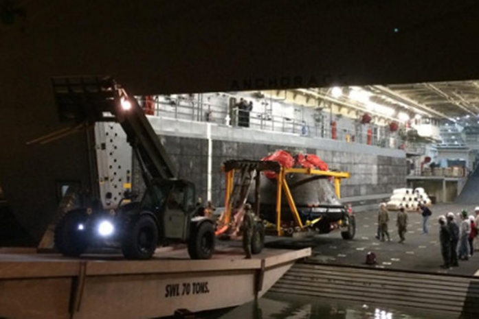 Капсула Orion упала в Тихий океан 5 декабря после первого испытательного полета аппарата. Примерно через час после приводнения специалисты НАСА и американские военные приступили к транспортировке капсулы на десантный корабль ВМС США.