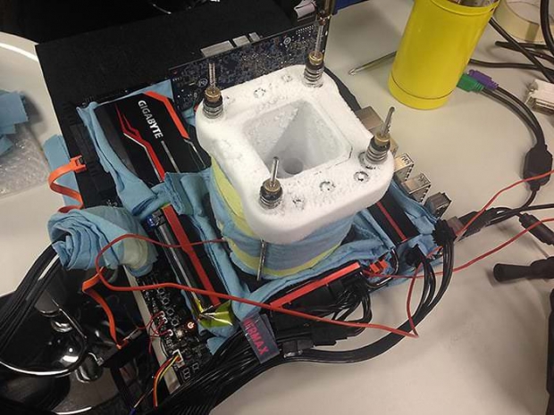 Энтузиаст Hicookie экспериментировал с процессором Core i7-5960X в связке с материнской платой Gigabyte X99-SOC Force-CF. В системе использовались оперативная память G.Skill DDR4 и блок питания мощностью 1500 Вт. Для отвода тепла была задействована система охлаждения на жидком азоте.
