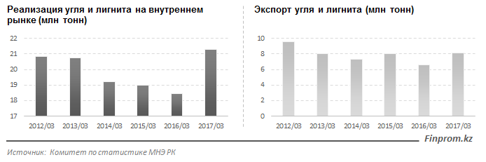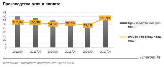 За январь-апрель 2017 года в Казахстане было произведено порядка 37,7 миллиона тонн угля (вкл. лигнит), объем добычи угля за год вырос на 18,9%.
