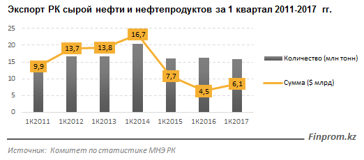 Некоторое восстановление цен на мировых рынках энергоресурсов увеличило выручку Казахстана от продажи нефти за рубеж. За 1 квартал текущего года общее поступление от экспорта сырой нефти и сырых нефтепродуктов превысило $6 миллиардов. Это на 35% больше суммы экспорта углеводородов за январь-март 2016 года.