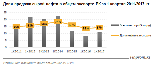 Власти в РК пытаются снизить свою зависимость от нефтяных доходов, но углеводороды остаются основным источником поступлений в экспортной деятельности РК – за год доля продажи нефти в общей сумме экспорта выросла до 57% с 55%. Тем не менее это ниже уровня зависимости в 2012-2014 годах, когда выручка от реализации нефти формировала 60-74% всего экспортного объема.