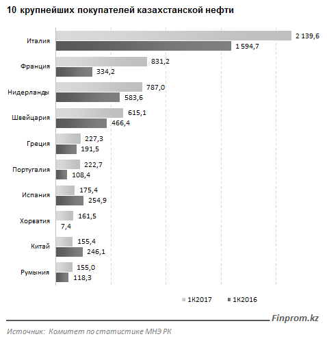 В 2017 году наиболее крупным покупателем казахстанской нефти по-прежнему остается Италия – порядка 34,8% доходов от продажи нефти обеспечила данная страна. За год объемы покупок итальянскими предприятиями сырья из Казахстана выросли почти на $545 миллионов, это самый значительный прирост показателя в листе стран-покупателей.