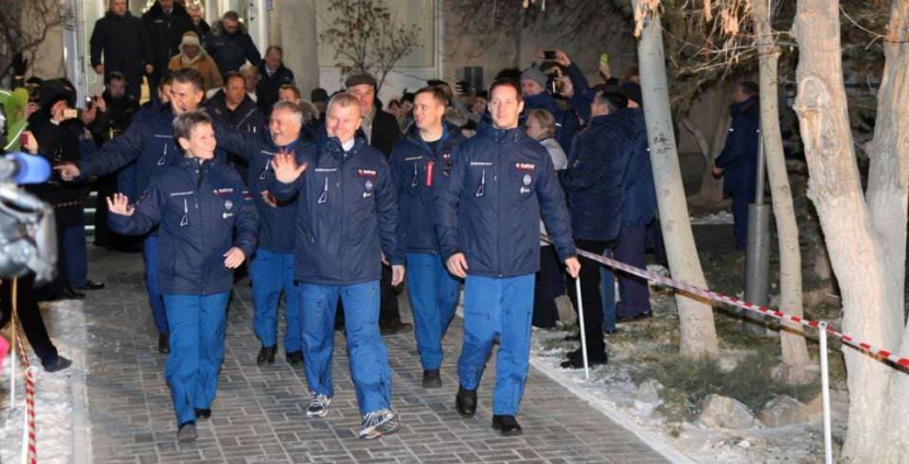 Космонавты и астронавты быстро прошли «живой» коридор, сели в автобус и затем направились в монтажно-испытательный корпус площадки 254 космодрома для облачения в полетные скафандры «Сокол» и их проверки на герметичность.