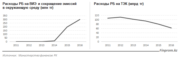 Переход к «зеленой экономике» учитывается и в расходах республиканского бюджета. Расходы РБ на ВИЭ и окружающую среду резко увеличиваются. За минувший год из РБ было выделено в общей сумме 299 млн тенге с ростом в 51% к 2015 году.