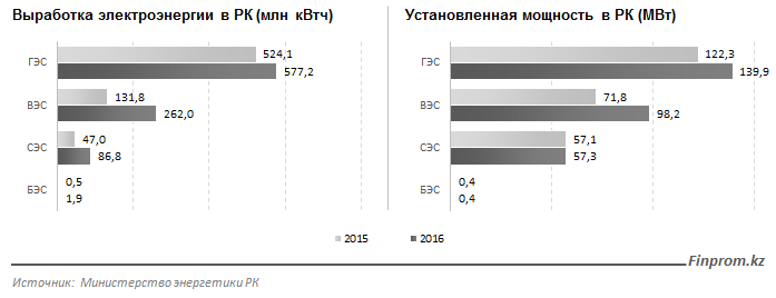 За 2016 год малые ГЭС выработали 577,2 млн кВтч, что на 10% больше 2015 года. Ветровые электростанции превысили производство 2015 года в 2 раза, выработав 262 млн кВтч. Солнечные электростанции увеличили выработку на 85% – до 86,8 млн кВтч. Биоэлектростанции нарастили производство энергии в 4 раза – до 1,9 млн кВтч.