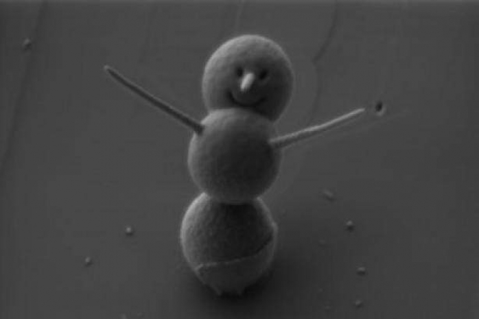 Фигурка сделана из микроскопических сферических частиц кремнезема. Черты лица снеговика – глаза и рот – были вырезаны при помощи сфокусированного ионного пучка.