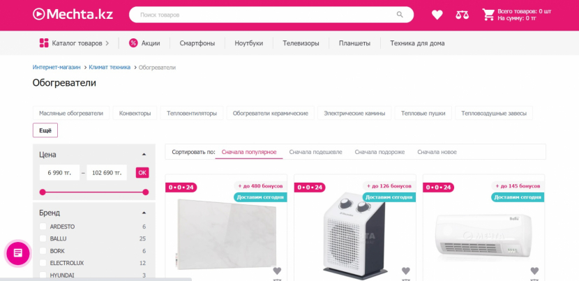 Торговая сеть «Мечта» осуществляет продажу бытовой техники и электроники. Она насчитывает 76 магазинов, расположенных в крупных городах Казахстана. Магазин обогревателей представлен широким ассортиментом климатических устройств различного назначения, мощности и принципа действия.