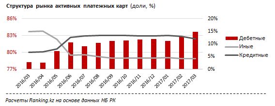 Дебетные карты снова пользуются спросом. Количество активных дебетных карт за год к концу марта 2017 года выросло на 803,0 тыс. ед. (12,8% - прим. ИА Total.kz) до 7,1 млн. Доля от всего количества активных карт увеличилась с 78,3% до 83,7%. Количество активных кредитных карт также увеличивается. Рост за год на 477,8 тыс. ед. (87,7% - прим. ИА Total.kz), до 1,0 млн. Доля выросла на 5,3 п.п. и составила 12,1%. На дебетные с кредитным лимитом и предоплаченные карты, наоборот, спрос сократился. Количество таких карт уменьшилось за год на 838,9 тыс. ед. (69,8% - прим. ИА Total.kz) до 362,7 тыс. Доля от всего количества активных карт упала с 15,0% до 4,3%.