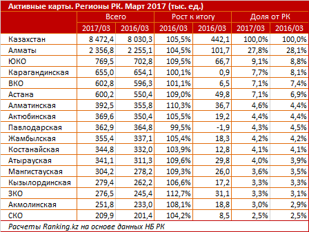 На втором месте по количеству активных карт ЮКО - 769,5 тыс. ед. Прирост составил 66,7 тыс. ед. (9,5% - прим. ИА Total.kz) за год к концу марта 2017 года. Самые распространенные активные карты в регионе дебетные - 94,0%. Доля активных кредитных карт - 0,6% - самый низкий показатель по РК. Замыкает топ-3 Карагандинская область - 655,0 тыс. ед. активных карт. Рост за год составил 0,9 тыс. ед. (0,1% - прим. ИА Total.kz). Доля активных дебетных карт составляет 94,5%, кредитных - 1,4%. Лидером по приросту активных кредитных карт является Алматы, количество кредиток выросло на 452,2 тыс. ед. (91,4% - прим. ИА Total.kz) до 1,0 млн. Практически все используемые кредитные карты РК приходятся на город Алматы, доля от РК за год выросла с 90,9% до 92,6%. Астана на втором месте по приросту - 4,2 тыс. (37,8% - прим. ИА Total.kz) до 15,3 тыс. ед. Доля от РК уменьшилась с 2,0% до 1,5%. Замыкает топ-3 Карагандинская область, прирост составил 3,7 тыс. (64,9% - прим. ИА Total.kz) до 9,4 тыс. ед. Доля от РК сократилась до 0,9% с 1,0%.