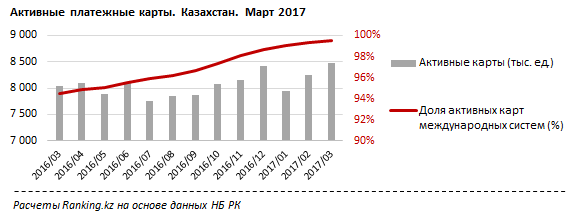 Количество активных карт за год к концу марта 2017 года увеличилось на 442,0 тыс. ед. (5,5% - прим. ИА Total.kz) до 8,5 млн. При этом доля платежных карт международных систем выросла за год с 94,5% до 99,5%, рост составил 841,3 тыс. ед. Карты локальных систем сократились на 399,3 тыс. ед. до 42,8 тыс., доля уменьшилась за год с 5,5% до 0,5%.