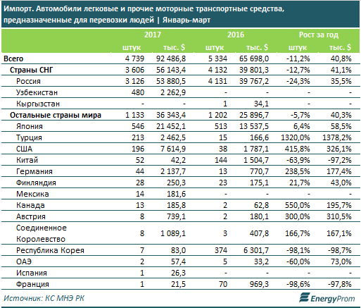 По итогам 1 квартала в РК завезли 4,7 тысячи легковых автомобилей и прочих транспортных средств, предназначенных для перевозки людей, на 92,5 млн долл США. В натуральном выражении отмечено снижение на 11,2%, однако в деньгах, напротив, наблюдается прирост на 40,8%.