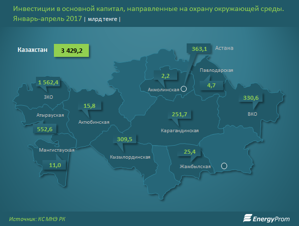 По итогам января-апреля 2017 инвестиции в основной капитал, направленные на охрану окружающей среды, составили сразу 3,4 млрд тенге против 2,9 млрд в аналогичном периоде годом ранее (+18,3%). Для сравнения, инвествливания в экологию за январь-апрель 2016 уступали аналогичному периоду 2015 в почти 11 раз.