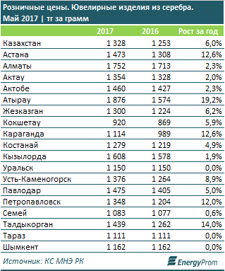 Дороже всего изделия из серебра обходились жителям Атырау (1,9 тыс. тг за грамм, +19,2% за год), Алматы (1,9 тыс. тг за грамм, +2,3% за год) и Кызылорды (1,6 тыс. тг за грамм, +1,9% за год).