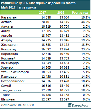 По итогам мая в розничных точках продаж цены на ювелирные изделия из золота для казахстанцев подорожали на 10,1% за год, до 14,4 тг за грамм.