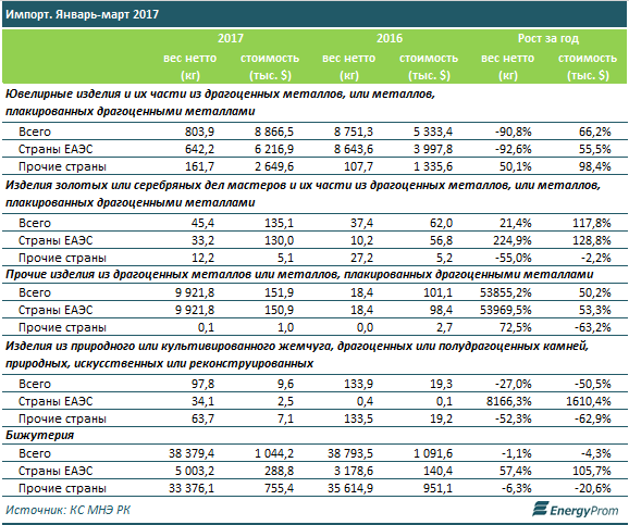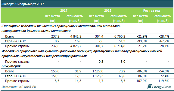 Экспорт Казахстаном ювелирных изделий по итогам 1 квартала также сократился: минус 21,9% в натуральном выражении и минус 28,4% - в стоимостном, как и экспорт бижутерии - минус 86,2% в килограммах и минус 54,6% - в деньгах.