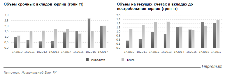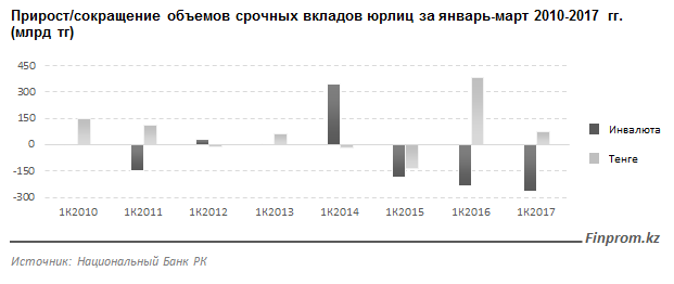 Готовность предприятий к инвестированию и увеличению деловой активности видна по динамике сокращения размеров валютных депозитов и соответствующему росту тенговых вкладов. По сравнению с уровнем годом ранее сумма по срочным вкладам юрлиц в инвалюте уменьшилась на 24%, в то время как по тенговым сбережениям объем вырос на 31%.