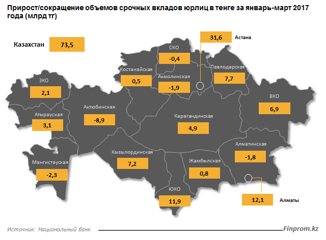 Наибольший прирост срочных вкладов в тенге за январь-март текущего года показали предприятия Астаны (на 31,6 миллиарда тенге), Алматы (+12,1 миллиарда тенге) и ЮКО (+11,9 миллиарда тенге).