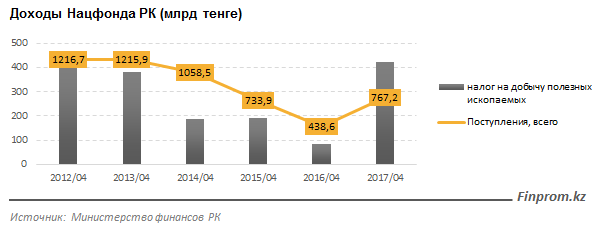 За январь-апрель 2017 года поступления в НФ превысили 767 миллиардов тенге, плюс 75% к аналогичному периоду прошлого года. Поддержку росту доходов оказала стабилизация ситуации на мировом нефтяном рынке, передает Total.kz со ссылкой на Finprom.