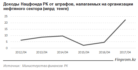 Также росту доходов способствовали штрафы, санкции, взыскания, налагаемые на организации нефтяного сектора, которые увеличились в 5 раз по сравнению с январем-апрелем 2016 года, составив 22,3 млрд тенге.