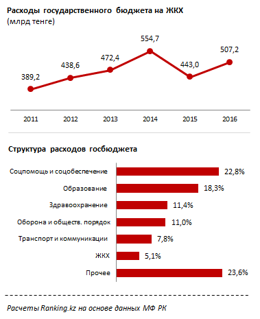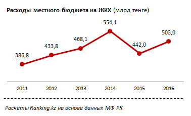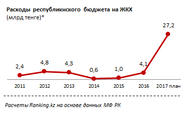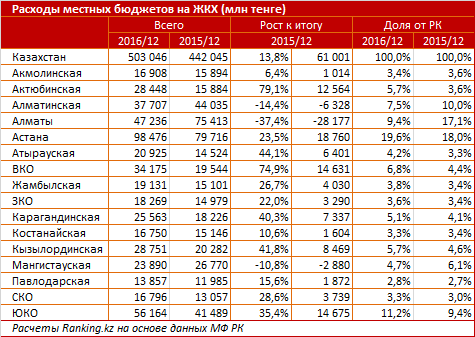 По итогам 2016 года лидерами по увеличению расходов на ЖКХ стали Актюбинская область (+79%) и ВКО (+75%). В Актюбинскую область было выделено 28,5 млрд тенге, а в ВКО 34,2 млрд тенге.