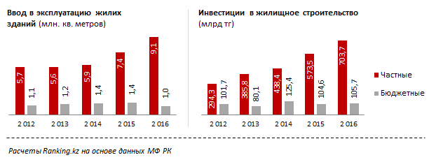 По итогам 2016 года было введено в эксплуатацию 10,5 млн кв. метров нового жилья, что на 17,5% больше 2015 года. Из них государством был введен 1 млн кв. метров на сумму 105,6 млрд тенге. Всего в сектор жилищного строительства и коммунального хозяйства было инвестировано 829,6 млрд тенге.