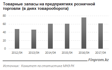 В январе-апреле в среднем товар реализовывался в течение 62 дней – это на 18% ниже уровня прошлого года, год назад средний срок товарных запасов составлял 76 дней.
