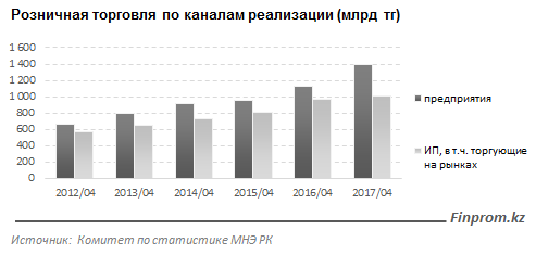 За этот же период объем торговли у индивидуальных предпринимателей, в т.ч. работающих на рынках, увеличился всего на 44,7 миллиарда тенге, или на 5%.