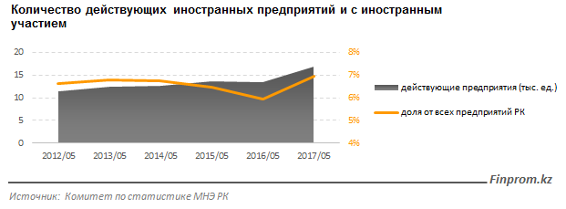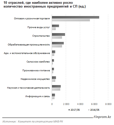 При этом общий прирост числа всех действующих предприятий в РК за год (с апреля 2016 года по апрель 2017 года) составил 7%.