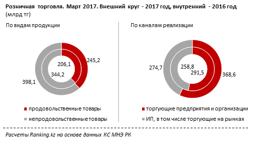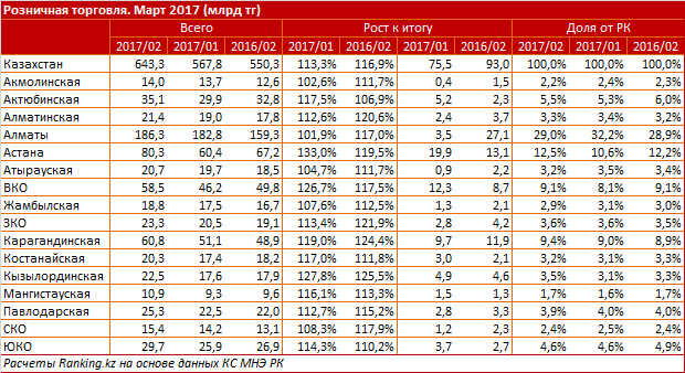 По итогам марта 2017 объем розничной торговли составил 643,3 млрд тг - на 13,3% больше, чем в феврале.