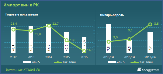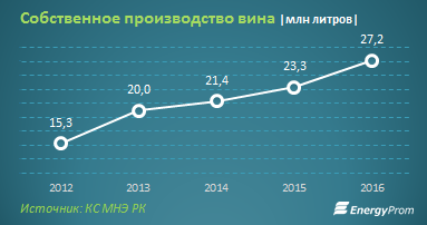 Казахстанское производство занимает 80% рынка вин. Объем производства вин за 2016 год увеличился на 17% и составил 27,2 млн литров вина. За четыре месяца текущего года производство увеличилось на 14% к аналогичному периоду прошлого года. А вот производство игристых вин сократилось на 35%.