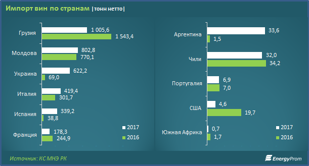 За два года импорт иностранных вин сократился почти вдвое как в денежном выражении, так и в физическом объеме, составив на конец прошлого года 14,6 тыс. тонн (нетто) на общую сумму $29,6 млн. Отметим, что за 2016 год потребление вина в Казахстане сократилось на 10%, потребление игристых вин на 5%.