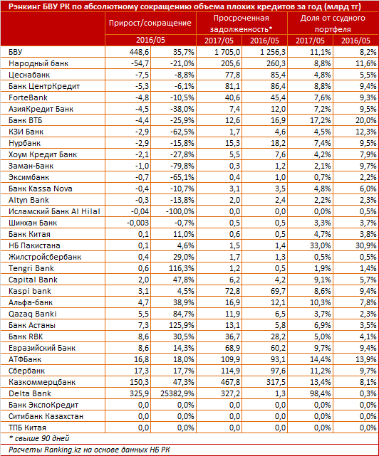 Наиболее значительно улучшить качество своих кредитов удалось Народному банку - объем просроченной задолженности свыше 90 дней уменьшился на 54,7 млрд тенге, или на 21% по сравнению с уровнем на конец мая прошлого года. Доля плохих кредитов занимает всего 8,8% в кредитном портфеле банка (11,6% год назад).