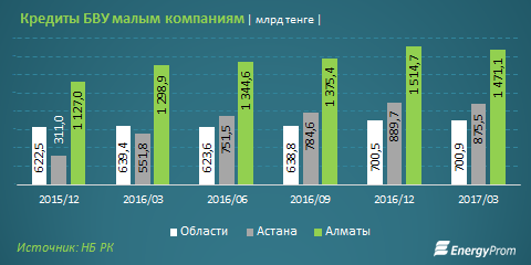 На конец 2015 года областной бизнес консолидировал 30% от всего ссудного портфеля банков по малому предпринимательству. По итогам первого квартала 2017 года залоговый дефицит в регионах обострился. Удельный вес регионов в общем объеме займов малым компаниям снизился до 23%. Почти половину банковских займов освоил малый бизнес Алматы, еще 29% – Астана.