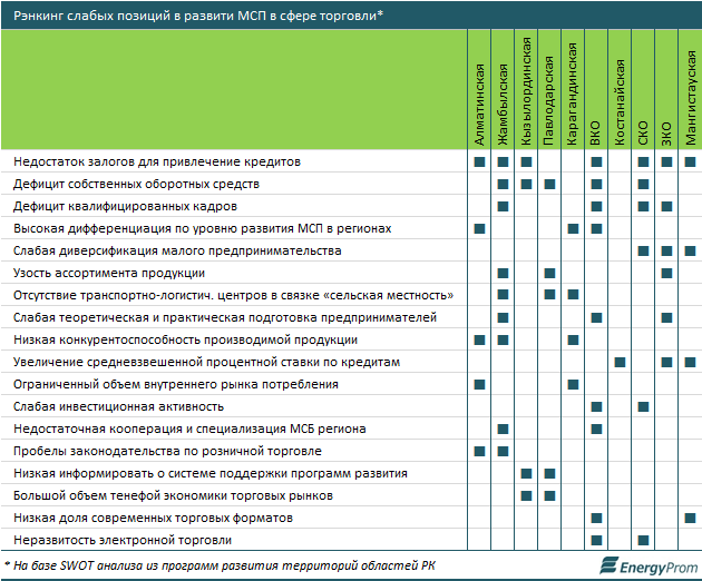 В рамках программ развития территорий областей (стратегические пятилетки социально-экономического роста регионов) дефицит залогового обеспечения для привлечения банковских займов обозначен как наиболее распространенный барьер роста предпринимательской активности. Из 10 опубликованных свот-анализов по развитию МСП эту проблему выделили семь акиматов. Банкиры предпочитают кредитовать бизнес мегаполисов, где стоимость основного залогового ресурса, недвижимость гораздо выше, чем в регионах.
