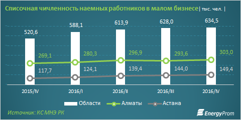 Списочная численность наемных работников, задействованных в малом бизнесе, за год (декабрь 2015 - 2016) увеличилась на 179,5 тысячи, превысив 1 миллион человек. Региональные малые компании обеспечили 634,5 тысячи рабочих мест – это 58%. Год назад штат наемных работников малых компаний в областях составлял 57,3%.