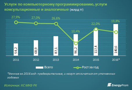 По итогам 1 квартала 2017 года объем услуг по компьютерному программированию и консультациям составил 28,3 млрд тг против 21,4 млрд тг годом ранее (+32%).