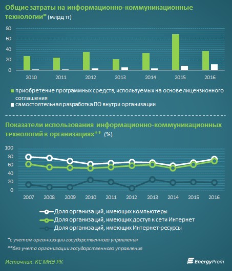 Общие затраты предприятий на информационно-коммуникационные технологии составили в 2016 году 269,5 млрд тг. Из них затраты на приобретение программных средств, используемых на основе лицензионного соглашения, составили 37,1 млрд тг - на 46,3% меньше, чем годом ранее. Самостоятельная разработка программного обеспечения, напротив, показала значительный прирост: +33%, до 11,6 млрд тг.